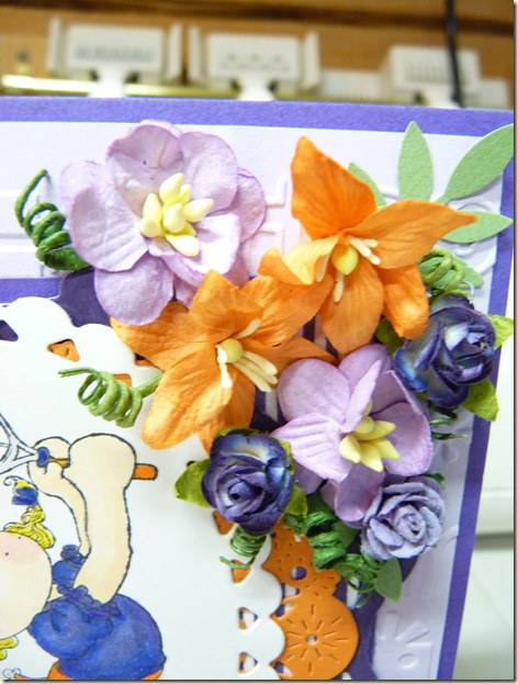I knew the purple and lavender flowers wouldn’t be a problem but wasn’t sure about the orange till the drawers came out. Once the flowers were in place I knew I had to add a purple bow to make it complete.